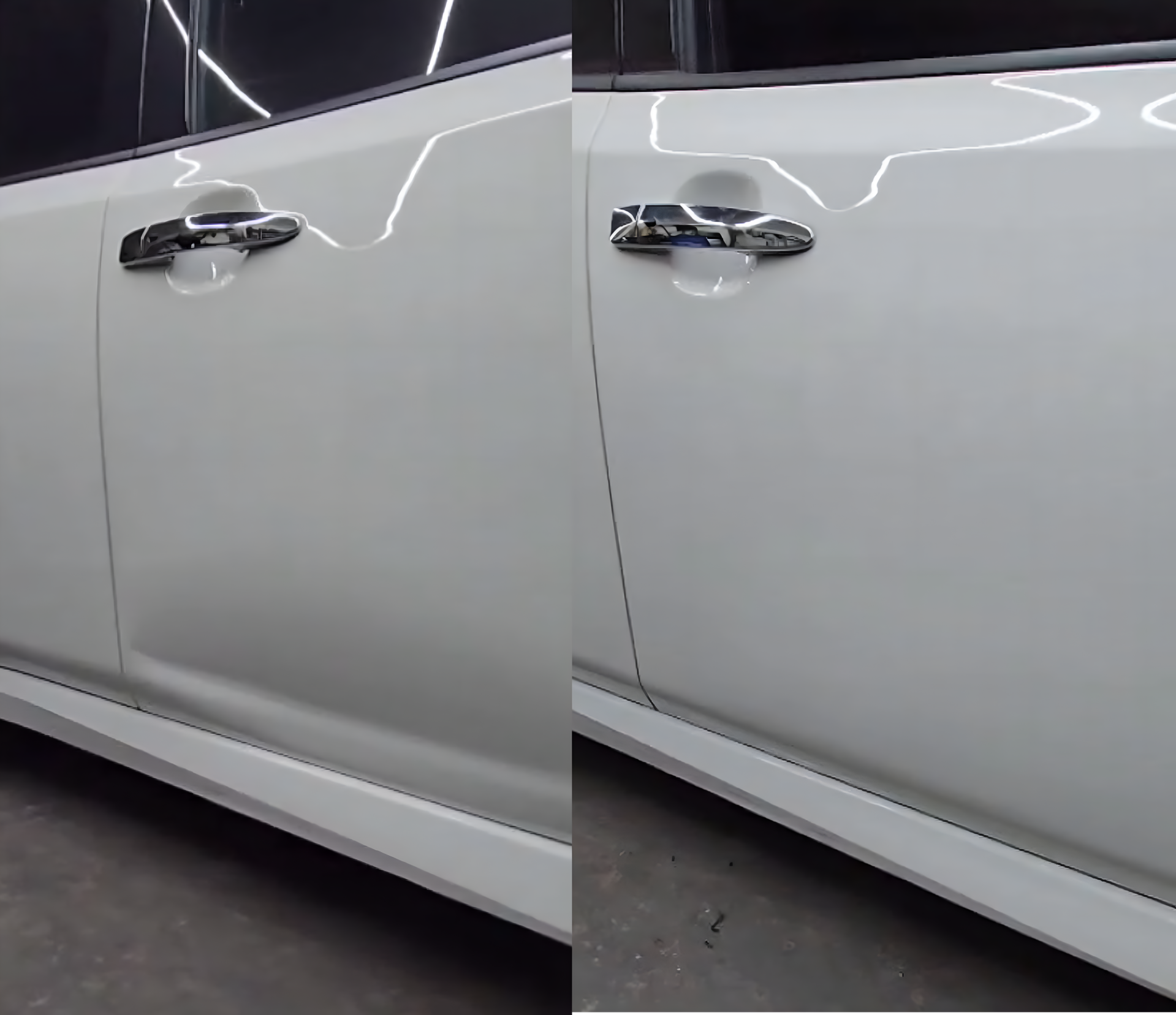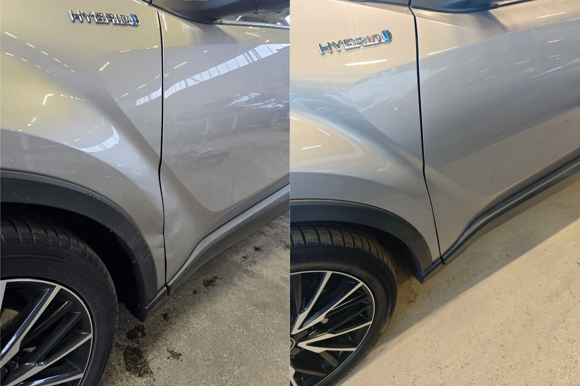 Vi använder speciella stänger och verktyg för att försiktigt trycka ut bucklan inifrån.Ingen slipning, spackling eller målning krävs.Resultatet blir osynligt – som om bucklan aldrig funnits.